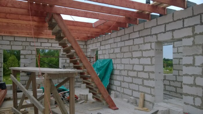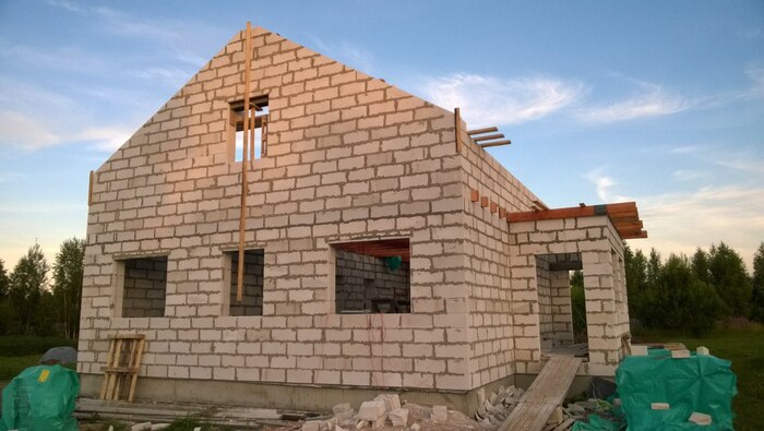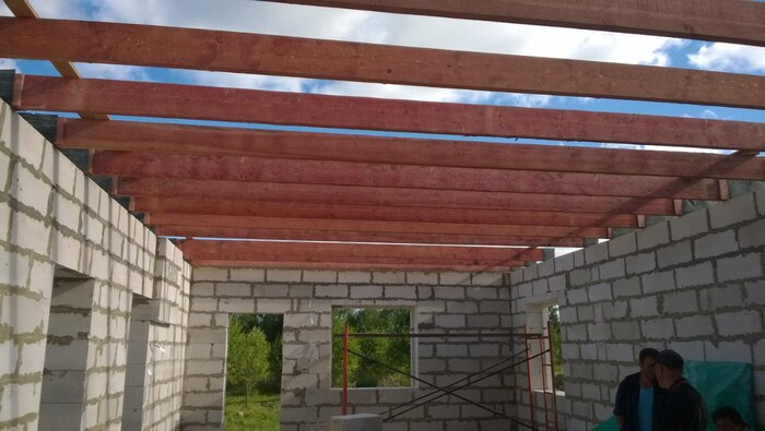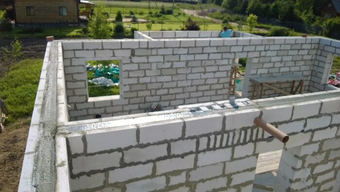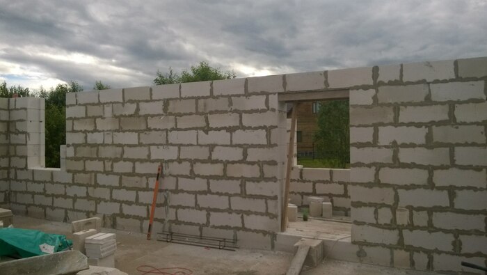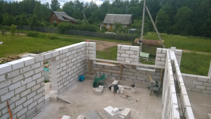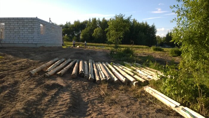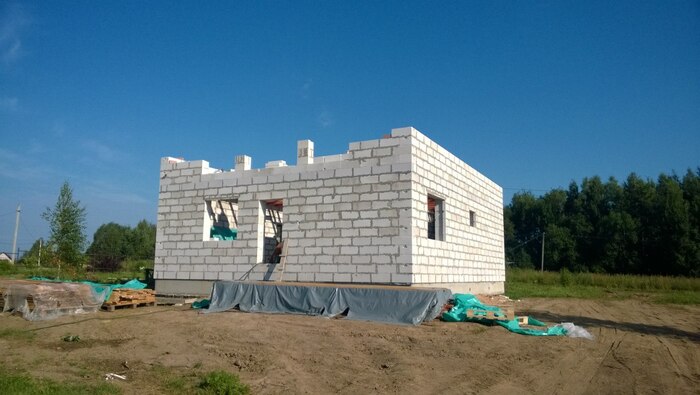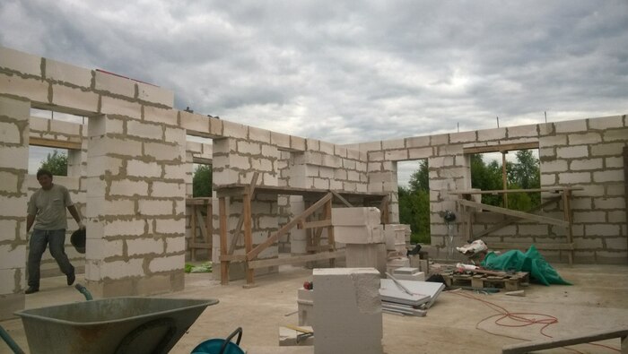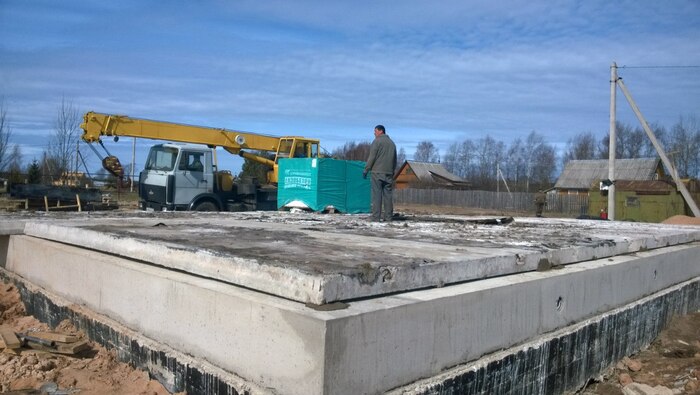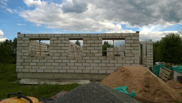 Это перекрытие технического подполья. Были закуплены Б/У плиты перекрытия, и успешно смонтированы. Заодно первые пара поддонов газобетона, его я закупил еще раньше, почти на весь объем, и складировал его у себя на базе, неподалеку. Тогда на заводах были акции, купи газоблок зимой, по сниженной цене, и забери весной. Я так и поступил.