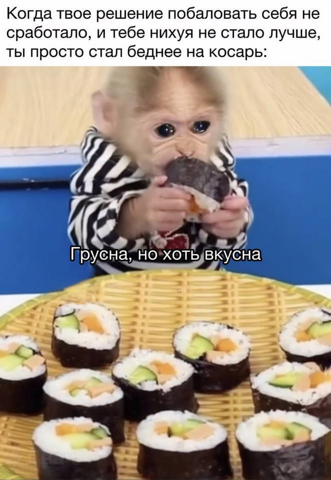 410 NikoDemon Юмор для всех и каждого Серия Мемы Тот самый заказ на последний косарик 1 год назад Показать полностью 1 Обезьяна Картинка с текстом Мемы Юмор Суши Косарь Грустный юмор Мат 12 9 1 Ещё 0