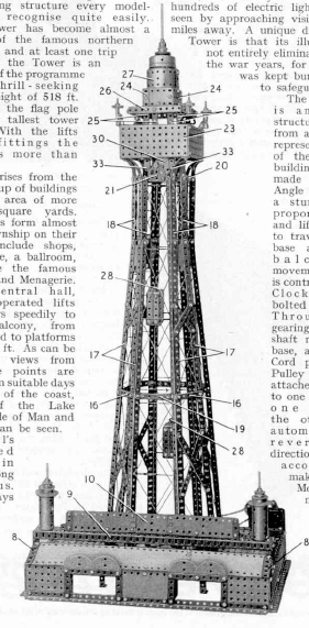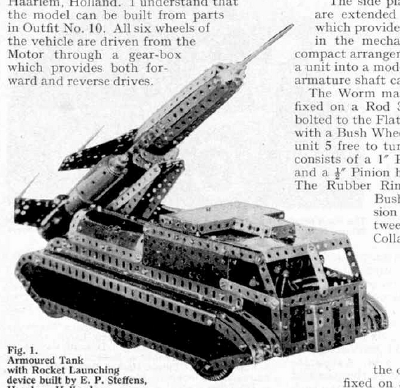 Продолжаем изучать материалы исходника, с которого создавался советский металлический конструктор- это наборы Английской фирмы MECCANO, популярные до сих пор. В их журналах для детей иногда мелькали реально безумные и шедевральные варианты сборок. Отметим, что и деталей для сборки требовалась масса, иногда даже не совсем стандартных.