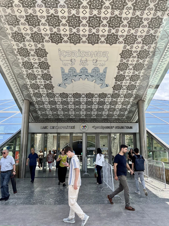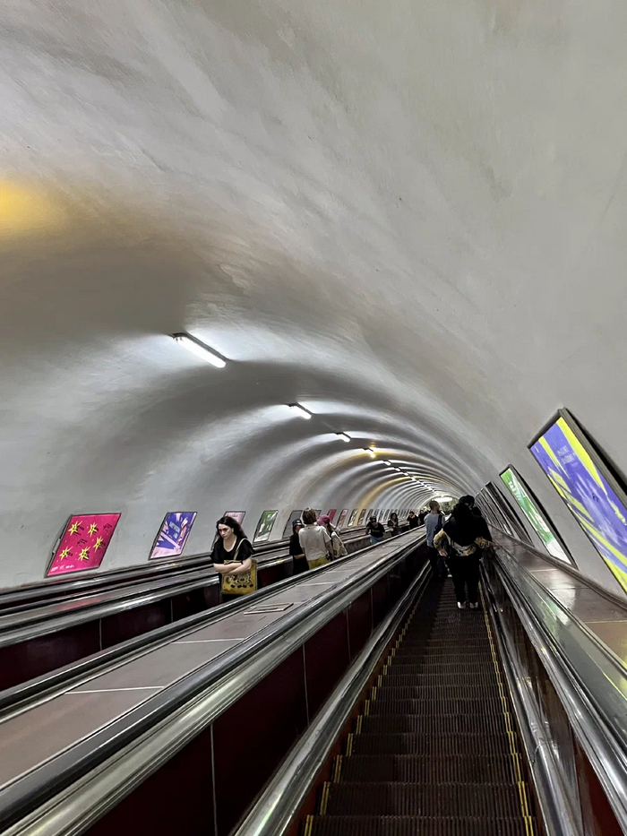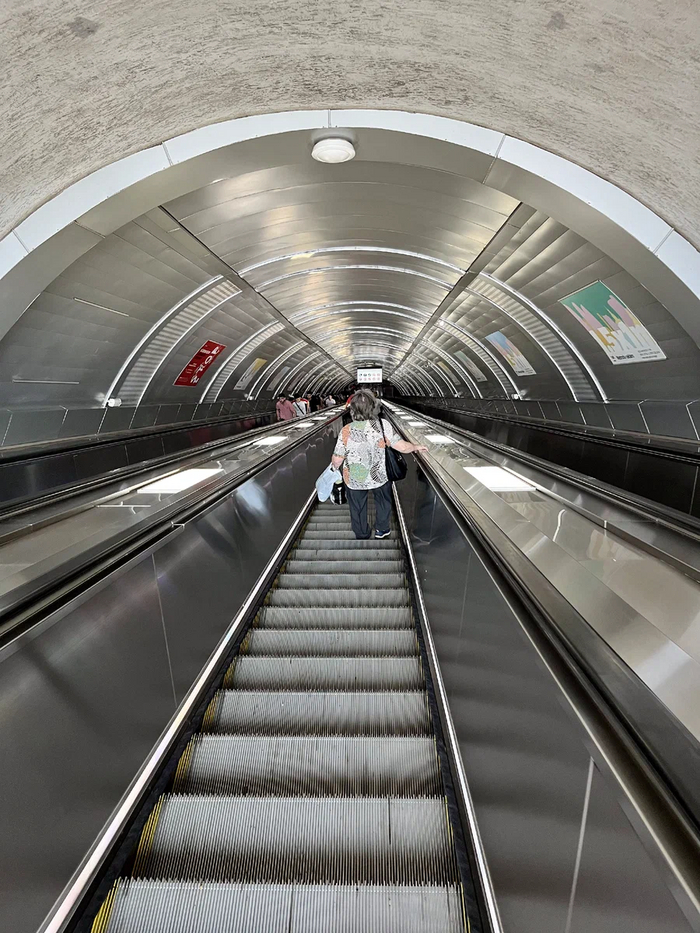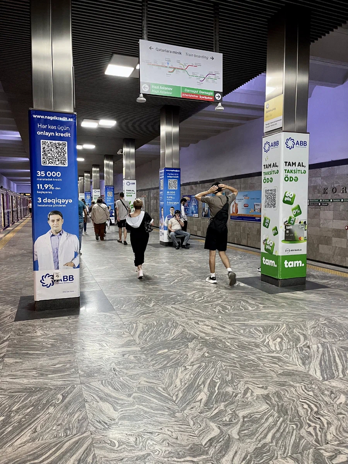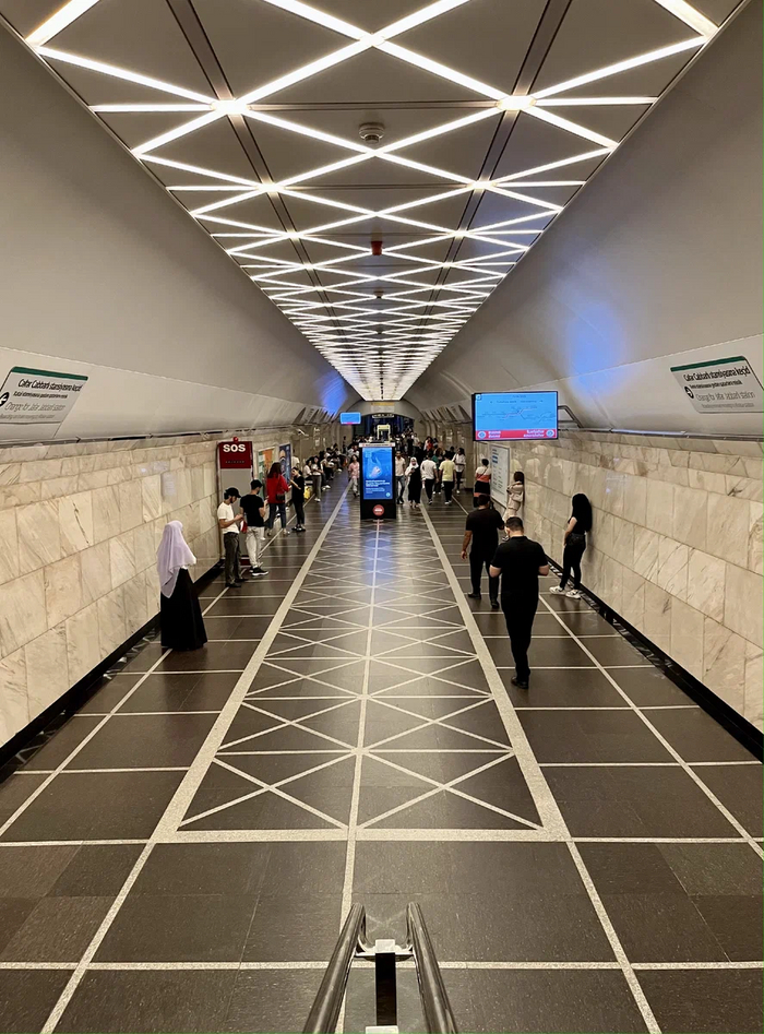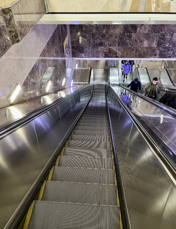 Спускаемся по свеженькому блестящему и оооочень медленному эскалатору. Напомнило Баку, там тоже никто никуда не спешит. А еще у эскалаторов нет привычных нам тётенек-контролеров, сидящих в будке.