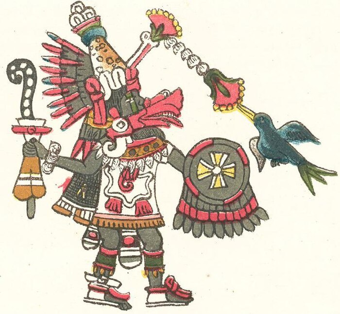 Этот бог и богиня родили четырёх сыновей. Старшего назвали Тлатлáуки Тескатлипока [фото 2, Красный Тескатлипока], и народы уэшотцинко и тлашкальтеки, для которых он был главным богом, звали его Камáштле. Он родился полностью красным. Второго сына назвали Йайáуки Тескатлипока [фото 3, Чёрный Тескатлипока] — он был старшим и самым могущественным из всех, командовал больше остальных, так как появился на свет посередине. Он родился полностью чёрным. Третьего сына звали Кетцалькоатль, также известный как Йоуáлли Эéкатль [фото 3, Ночной Ветер]. Четвёртого и самого младшего звали Омитéотль, он также был известен как Макуицкоатль [Двухголовый Змей], но мексиканцы [мешика] называли его Уицилопочтли [фото 4, Колибри Юга или Колибри-левша], потому что он был левшой. Он считался главным богом у мексиканцев, так как на их родине он был почитаем больше остальных, а также потому, что был более склонен к войне, чем другие боги.