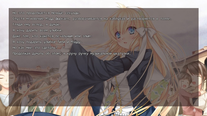 Заставляет ли новелла испытать много различных эмоций? В целом, ей удаётся накатить волны грусти и радости. Однако больший упор игра делает на печаль. С неё начинается новелла, про неё вспоминают в середине истории со смертью незнакомца, и почти до заключительных титров она никуда не уходит. Задние фоны с видом пыльных улиц не добавляют радости, а нападение группы людей давит тяжестью на сердце главного героя, задевая при этом читателя.