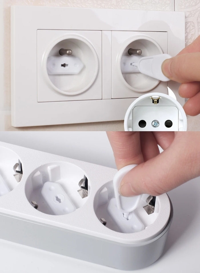 Заглушки в удлинители и розетки со специальным отдельным ключиком для их извлечения. Стоит 20 штук 320 руб. Ссылка на них