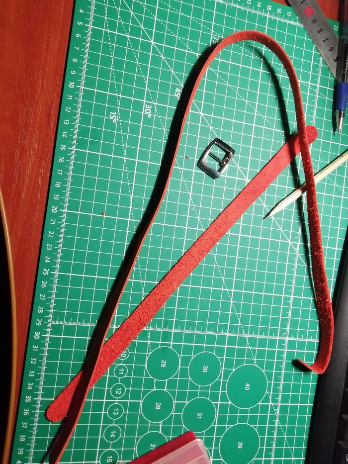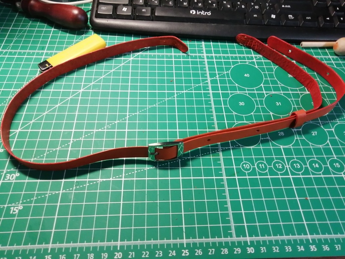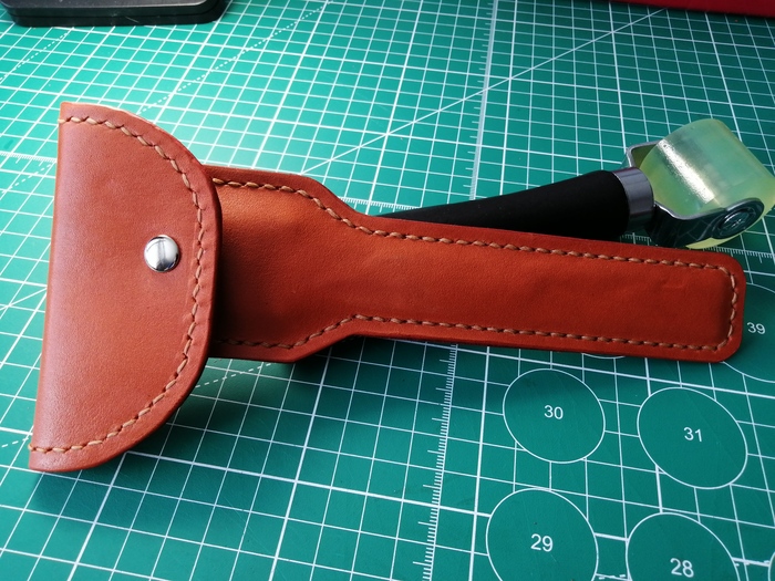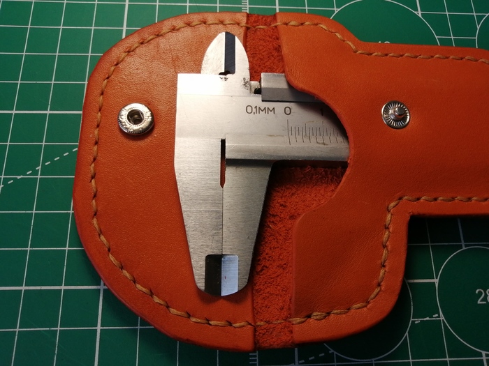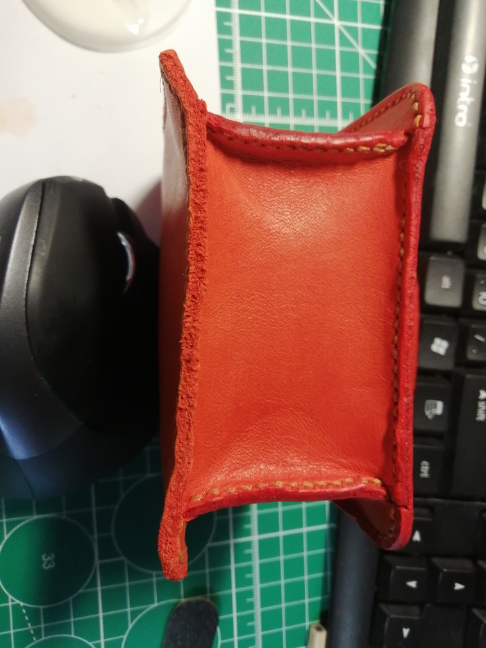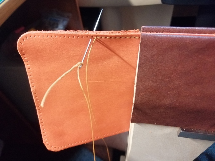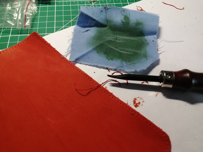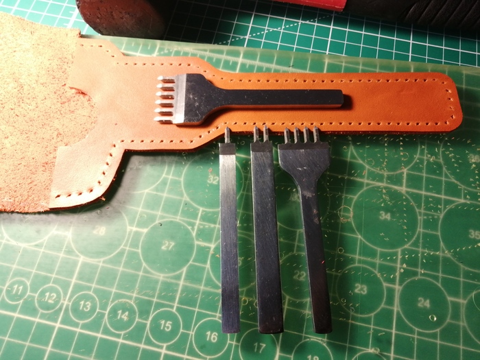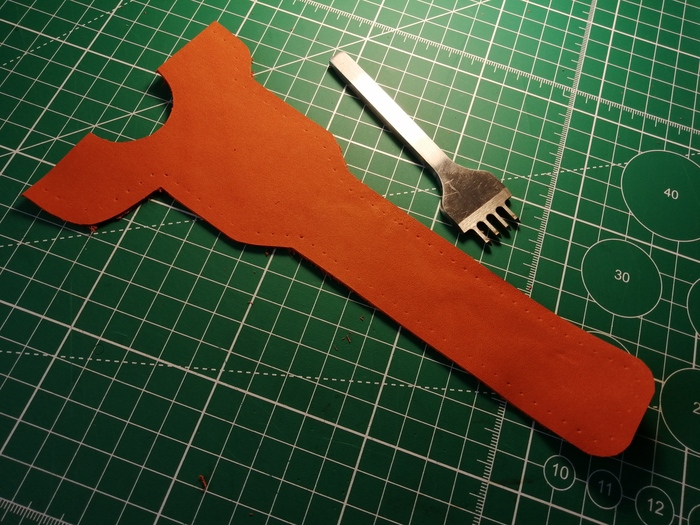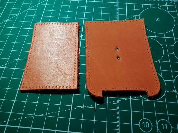Срезал кромку и прошил; в процессе прошития пришёл к такому выводу: если при пробитии двух слоёв кожи за раз пробивать недостаточно глубоко, то нижний слой кожи прокалывается не до конца, отверстие в нём получается меньше и это сказывается на красоте шва. Пришлось докалывать пробойником отверстия вручную.