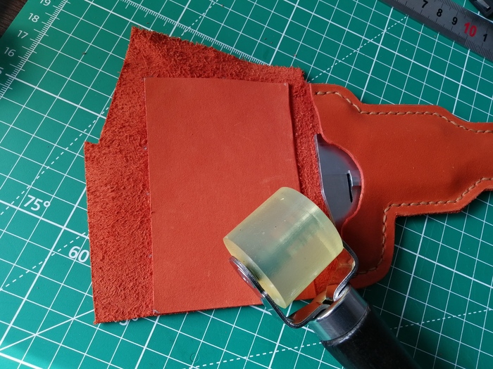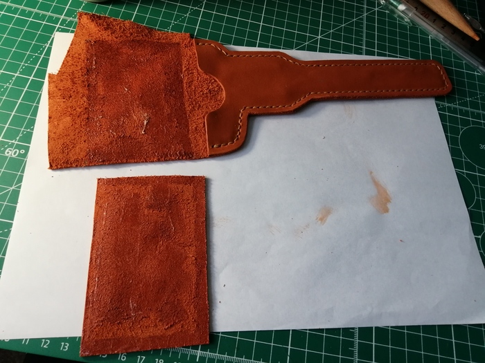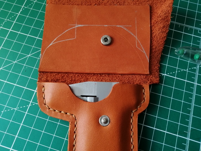 Инструмент в ней сидел бы не плотно, поэтому решил разработать самостоятельно. Для клапана оставил кусок кожи побольше, решив разметить его потом уже, по факту.