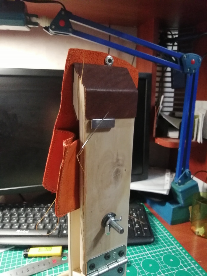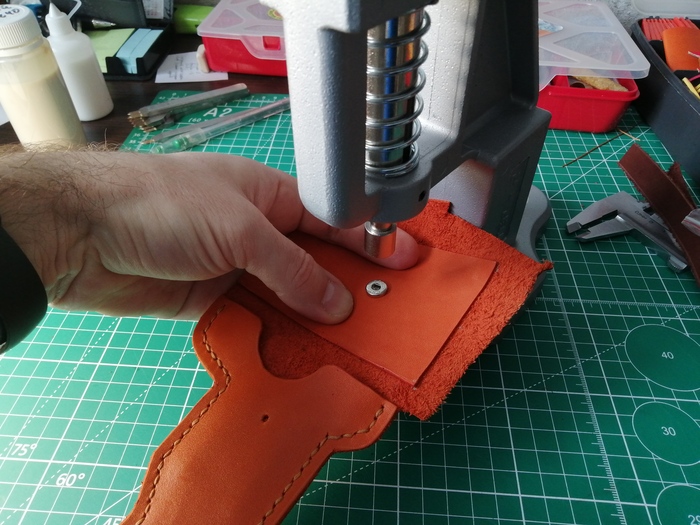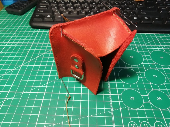 Теперь занялся клапаном. Чтобы он получился пожёстче и держал форму, я усилил его вторым слоем кожи. Установил кнопку.