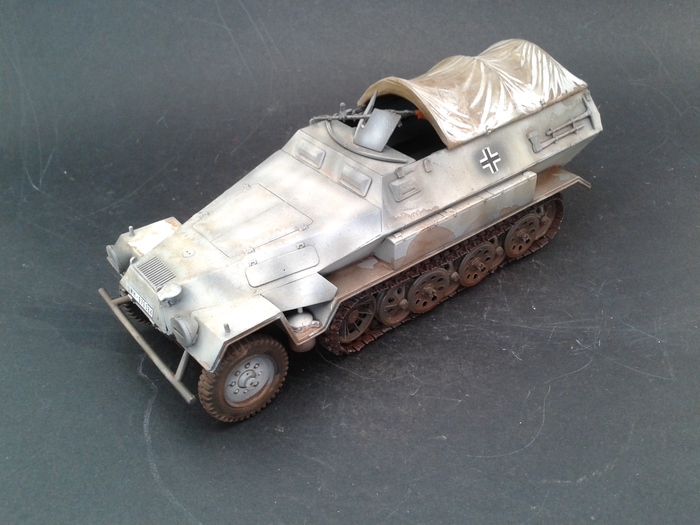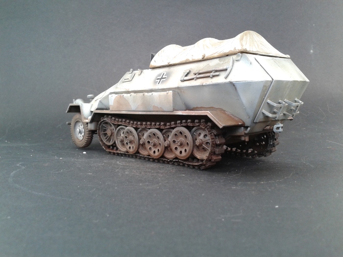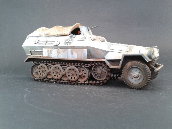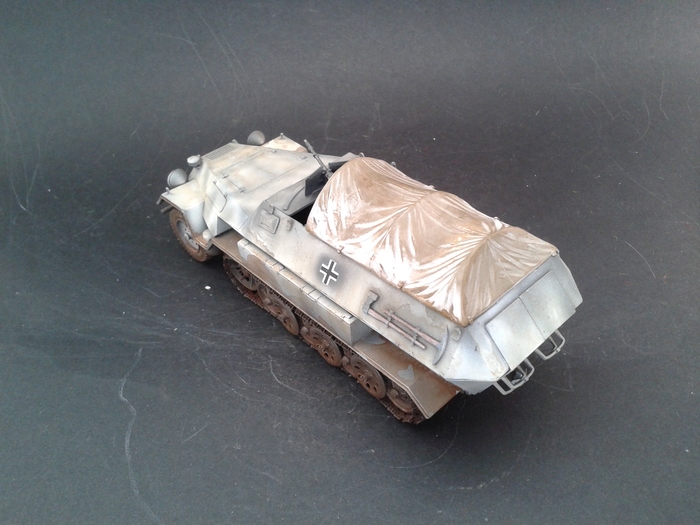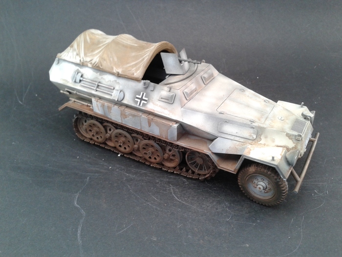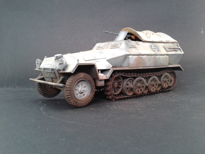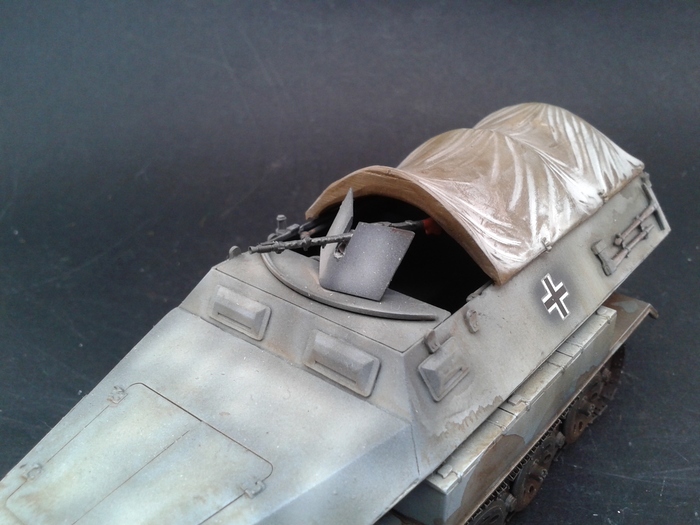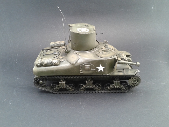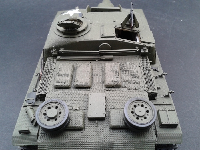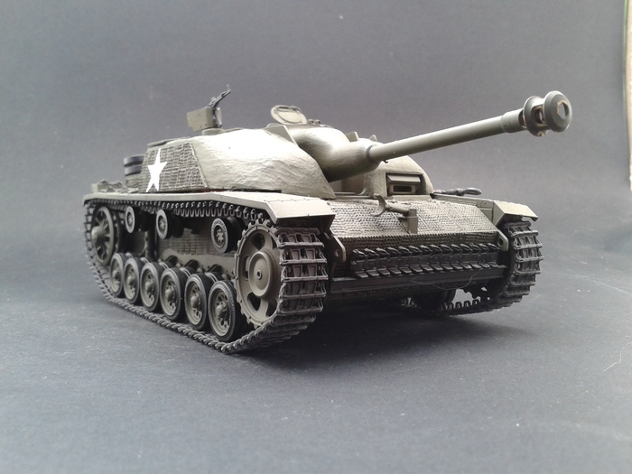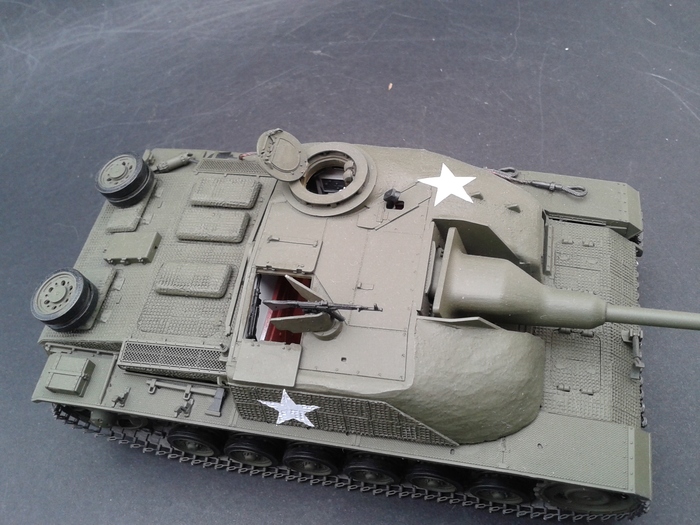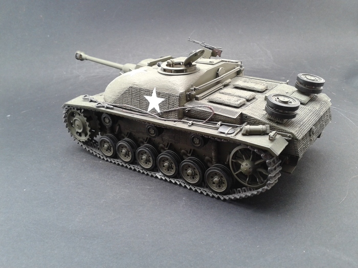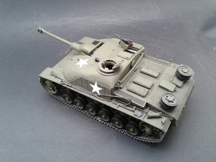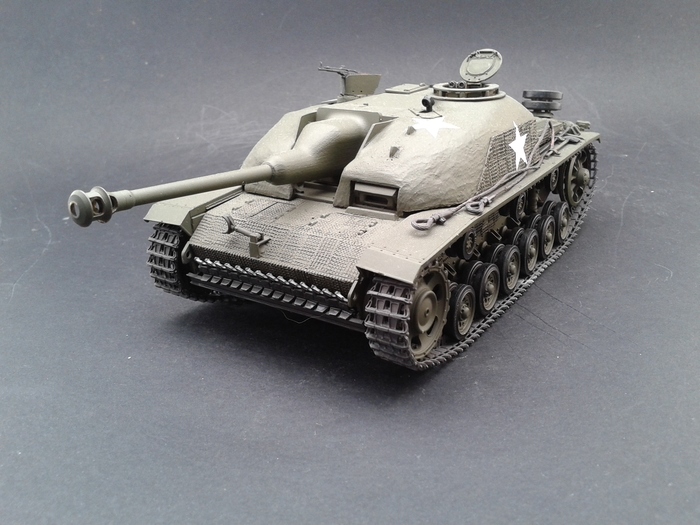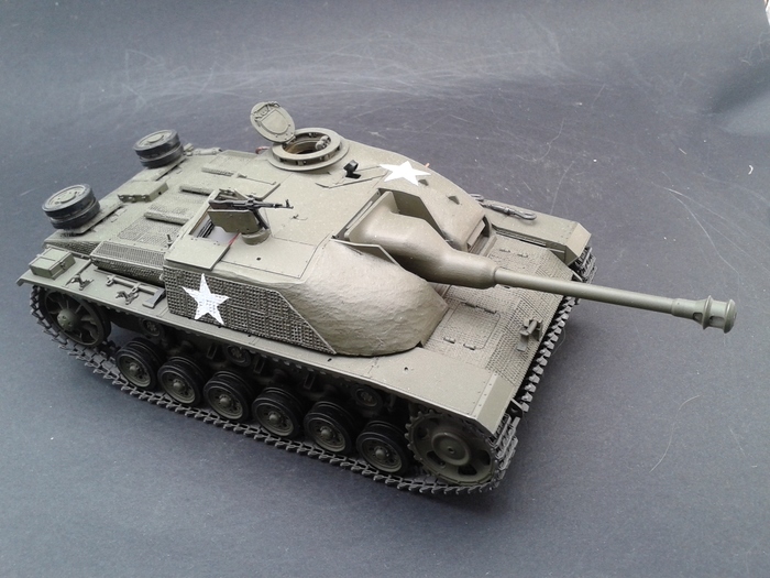 Делал модель по мотивам фото,на которой американцы едут на трофейной САУ. Перекрасил в олив драб,нанес звезды и вместо пулемета МГ на рубку поставил штурмовую винтовку .Покрашено акрилом Тамия.