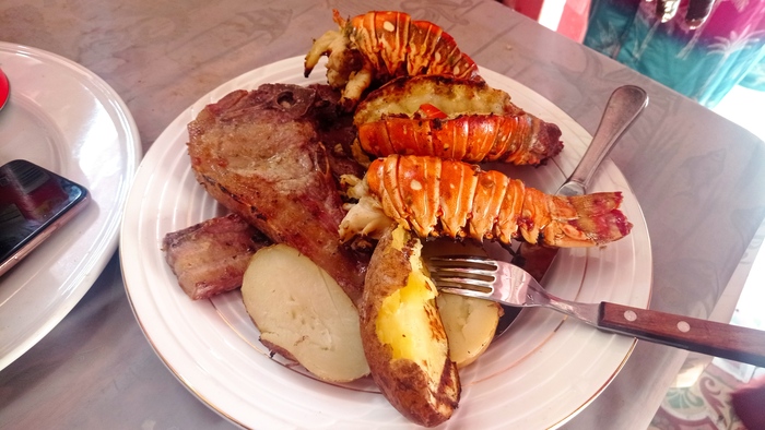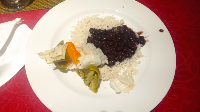 Ресторан предлагал ограниченный ассортимент блюд: всегда рис и бобы, некоторые свежие овощи и зелень, маринованные овощи, салаты (их попробовал и остановился), мясо и рыбу на гриле. Из фруктов: папайя, ананас, гуайява, иногда манго, арбузы белые и не сладкие. Мороженое очень сладкое. Вина нет, предлагают пиво или газировки с сахаром.