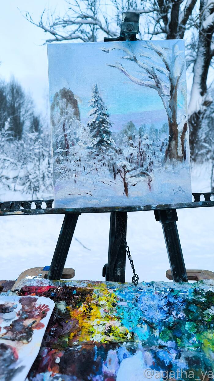Так уж сложилось, но все зимние пленэры были в деревне. В январе. Конкретно этот я писала с трудом. Закончился вайтспирит. В хозяйственном вщяли новый... С запахом!! И это не просто мучение, испарения его точно влияют на сознание не в лучшую сторону. Апатия, печаль и разочарование... Да-да, это точно испарения и запах отравы))