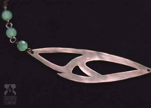 Идея пришла почти сразу, но изначально вместо бутылки хотела сделать бюст)) А вообще, это первое крупное украшение из металла, помучилась с ним немного. Сделано из меди с бусинами хризопраза.
