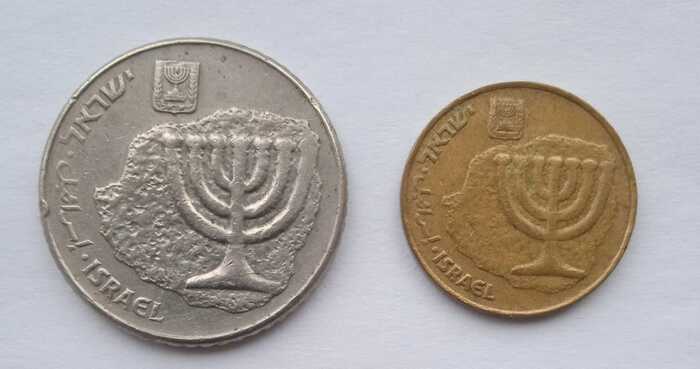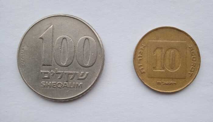 Вот, для сравнения, монеты 100 шекелей 1984 года и 10 агорот 1998 года