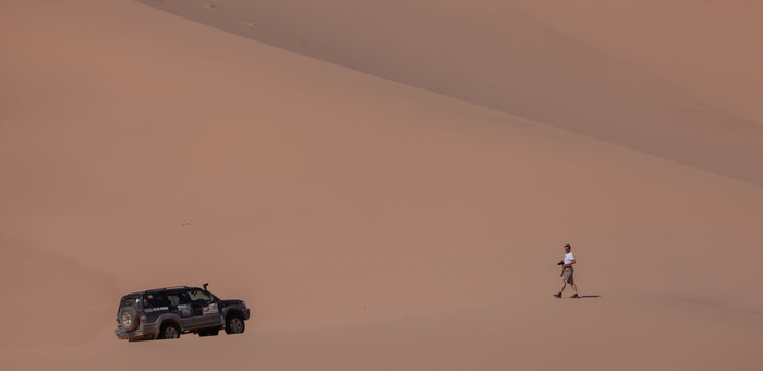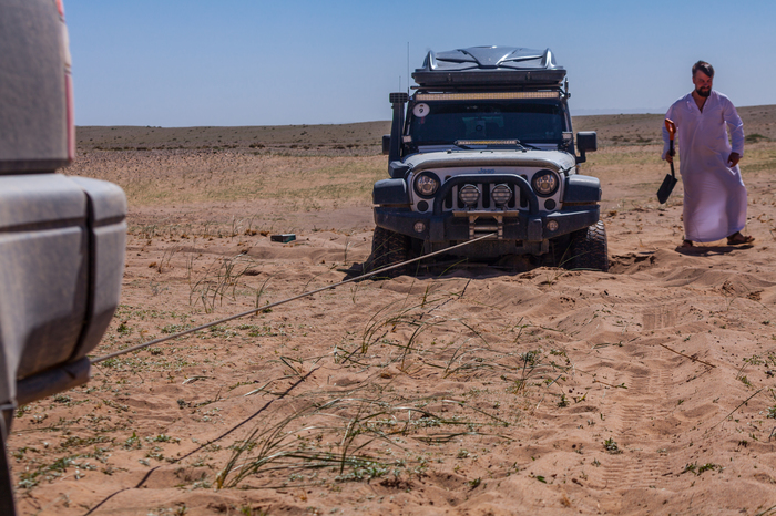 При езде по пескам копать приходится много - ну это если вы едете одной машиной, или если закопались очень глубоко. В данном случае, фото постановочное :-)