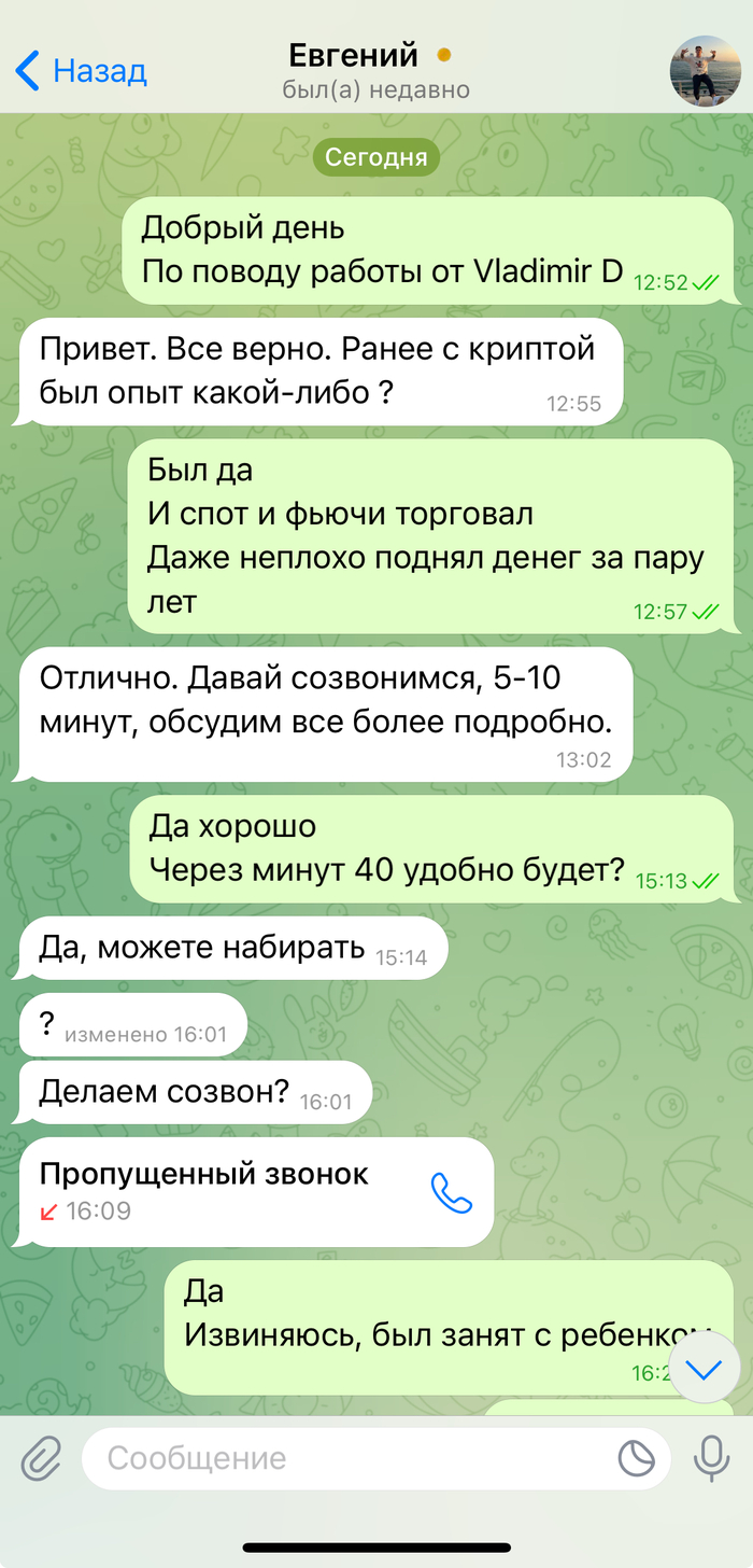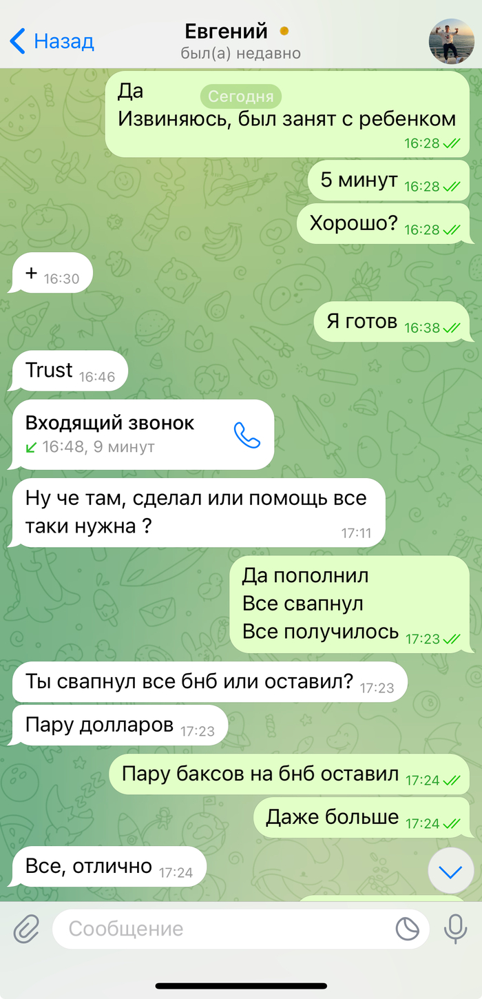Может сыграло, что при разговоре я рассказал, что относительно опытный в крипте и денег у меня достаточно. Может Евгений почувствовал запах денег, что и сподвигло пропустить шаг со скриншотом.