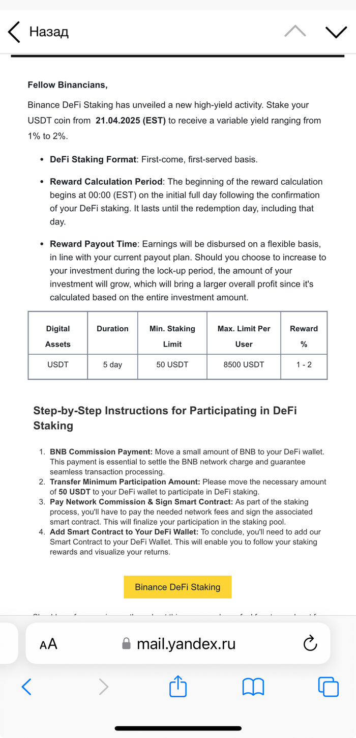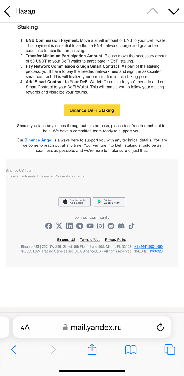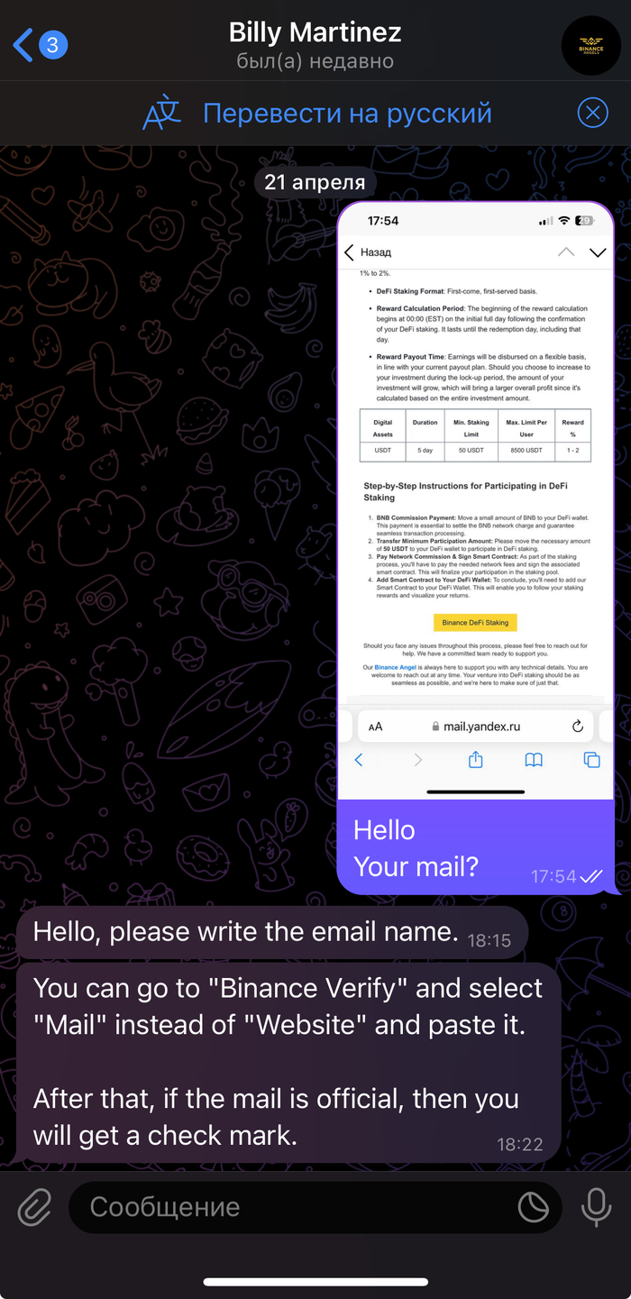 Куча текста, куча всякой инфы, письмо похоже на оригинальное. В конце есть ссылка на тг поддержки Бинананс. Она отвечает в лс, в тг. Не знаю реален ли он, или это фейк нашего мошенника.