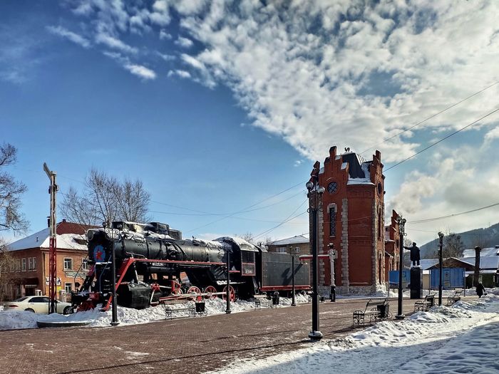 Рядом с башней стоят паровоз Лебедянка и "ленин-бурят".