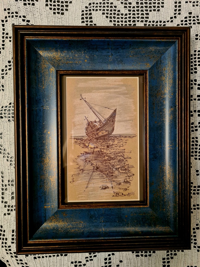 Сначала про первый кораблик. Рисовала, спасаясь от головной боли. Так бывает. Пока таблетка подействует... А ты уже в процессе, занята и не думаешь про земное. Так вот первый кораблик моментально нашёл хозяина! А когда его оформила правильно, он стал изюминкой в любой достойный кабинет или на стену путешественнику в память о былых походах! Второй кораблик на подходе!