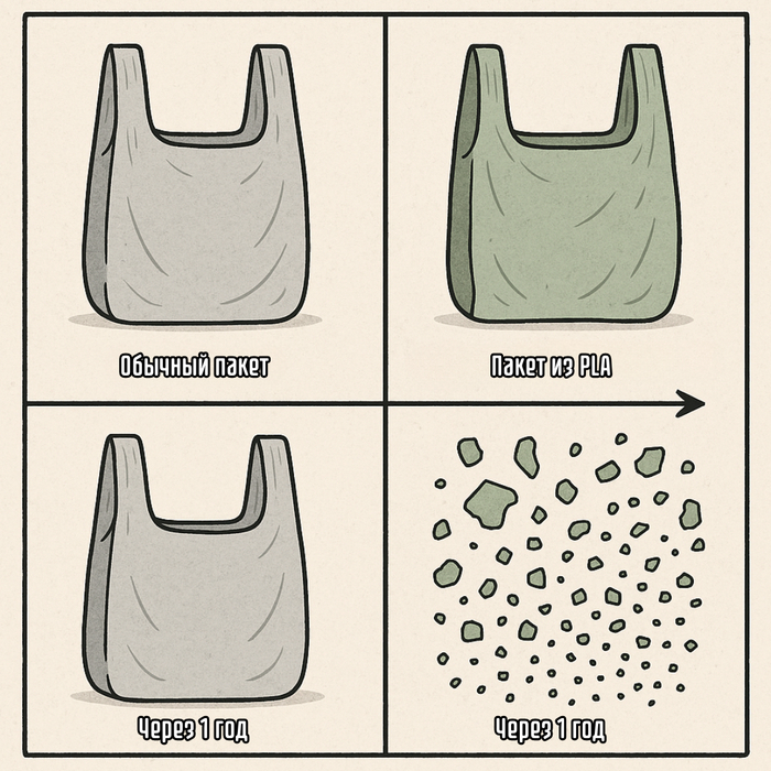 В отличие от обычного пластика 🗑️, PLA хорошо разлагается под воздействием микроорганизмов (свойство биодеградации) 🦠. В подходящих условиях на это может уйти всего несколько месяцев ⏳, в то время как для разложения обычного пакета может потребоваться более 100 лет 📅.