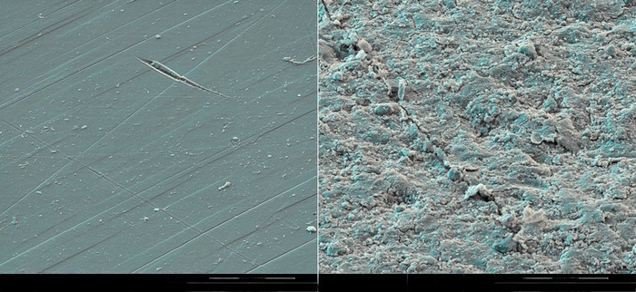 Бонус: поверхность пластика (ПЭТ-бутылка). Слева — новый образец, справа — образец, обработанный песком и ультрафиолетовым (УФ) светом для имитации воздействия окружающей среды. На поверхности справа отчётливо видна деградация.