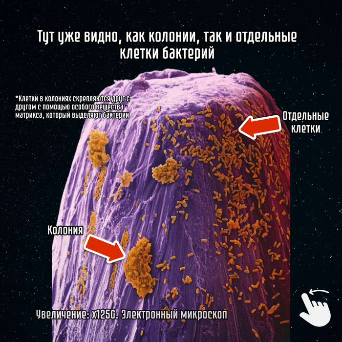 Бонус: Срез зубного камня. Электронный микроскоп. Хорошо видно, как различные виды бактерий (разноцветные палочки и шарики) образуют внутри налёта обширное по видовому составу микробное сообщество.