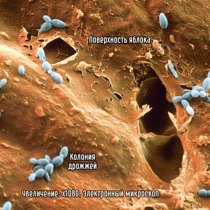 Подгнившие плоды — это настоящий пир для микроорганизмов! 🦠🍄 Первыми за работу обычно приступают дрожжи (Saccharomyces, Candida, Hanseniaspora), превращающие сахара, которые в больших количествах содержатся в спелых плодах, в спирты и кислоты 🍷➡️🧪.