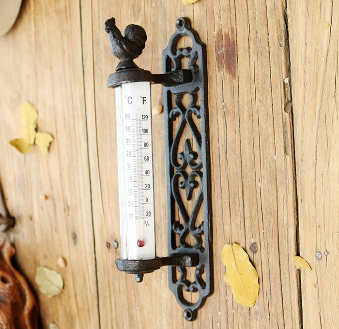 Термометр сочетает практичность и винтажный стиль, создавая атмосферу старинного аксессуара. Корпус выполнен из чугуна, что придаёт изделию вес и долговечность. Большая шкала с чёткой разметкой позволяет легко считывать показания температуры.