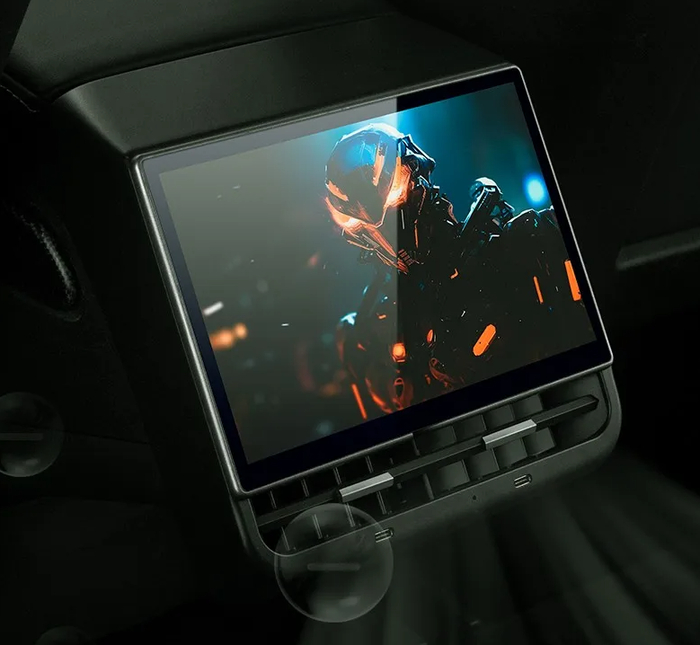 Корпус выполнен в стиле Tesla, что делает экран гармоничным дополнением салона. Это устройство значительно повышает уровень комфорта в поездках. Оно превращает задние сидения в мультимедийную зону с широким функционалом.