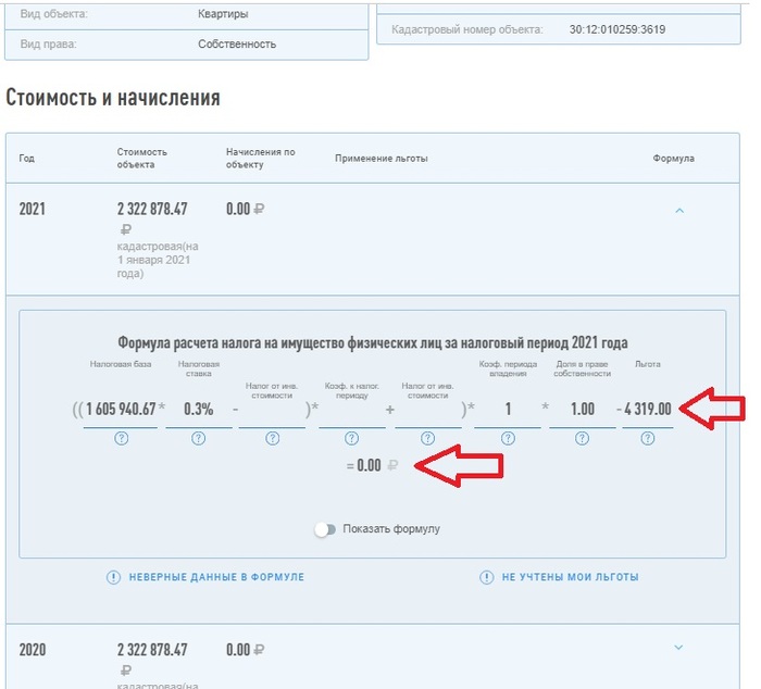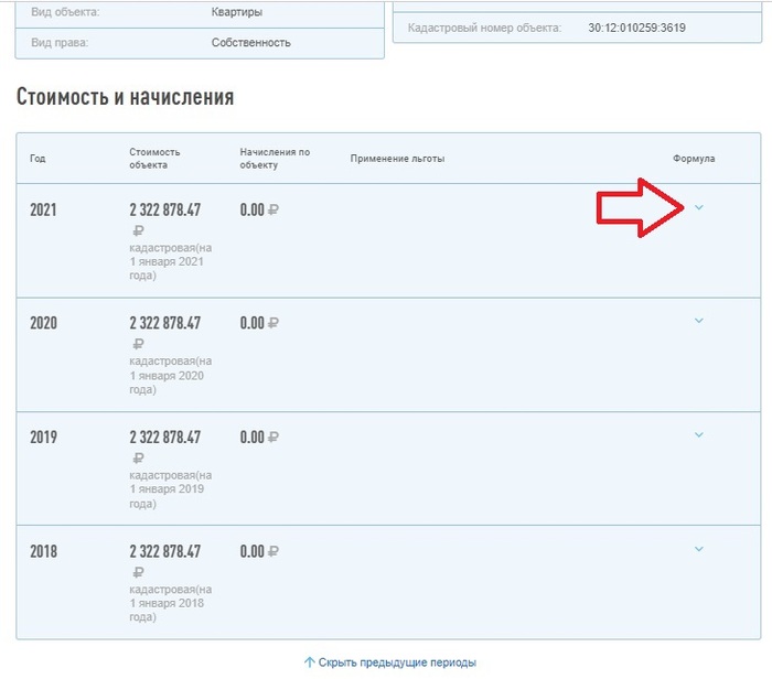 Далее можно проверить расчет налога. Переходим в раздел «Имущество» и нажимаем на прямоугольник с нужным объектом. Нас интересует раздел внизу страницы «Стоимость и начисления».