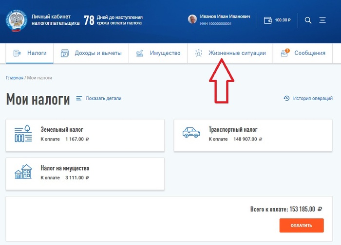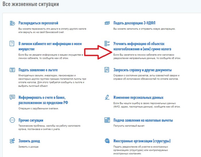 Если же выяснилось, что льгот у вас нет, случай с суммой налога менее 100 руб. тоже не ваш, а налоговое уведомление не прислали, то нужно отправить обращение в налоговую. Переходим в раздел «Жизненные ситуации».