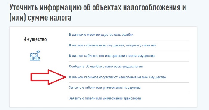 Выбираем «В личном кабинете отсутствуют начисления на моё имущество»