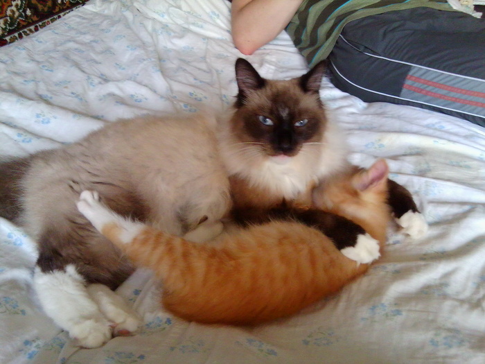 Причем, если при встрече Иры и Баси мы почему-то очень боялись, что он ее съест, то в этом случае нам почему-то сразу же стало понятно, что огромный кот не причинит вреда малышу. Даже опасений никаких не было. Эта бесстрашная рыжая блоха, которой, очевидно, родители забыли сказать, что больших и страшных зверей надо бояться, беспардонно залезла верхом на кота и больше не слезала. Бася таскался с ним, как со своим детенышем, играл, вылизывал. На старшую кошку просто вообще перестал обращать внимание, - ему, явно, не до склок было, ему ребенка надо было воспитывать!.. И сама Ирочка тоже как-то сазу успокоилась. Куда делась и ее агрессия, и ее пугливость!.. Дружелюбия, правда, к новым членам семьи она не проявляла, - просто спокойно наблюдала за ними со стороны.