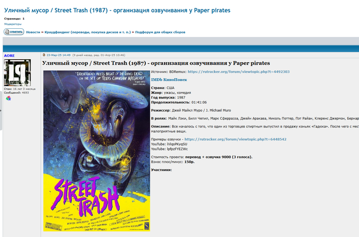 Наш канал по озвучке - https://t.me/PaperPiratesvoice - делаем озвучку к качественным старым фильмам, которые в свое время ее не получили. Беремся за заказы, но их пока не было)) Все озвучки сделаны за донат, но донат добровольный и смотреть и качать все можно свободно (все выкидываем в сеть и можно распространять как вам угодно). Озвучка часто бюджетная, тк актеры работают за минималку + известные голоса делают скидку 50-70% (чисто по 2 причинам - интересные проекты + нет жестких сроков по сдаче озвучки).