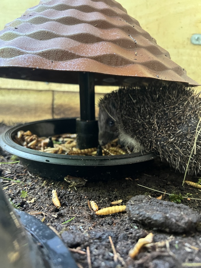Ежики крепнут, обладают отменным аппетитом. Так как сейчас главная задача это набор массы, проконсультировавшись со специалистом, мы помимо кормления по расписанию живой пищей, теперь оставляем всегда в доступе еще и корм в миске. В основном сухих насекомых. Съедают абсолютно всё.