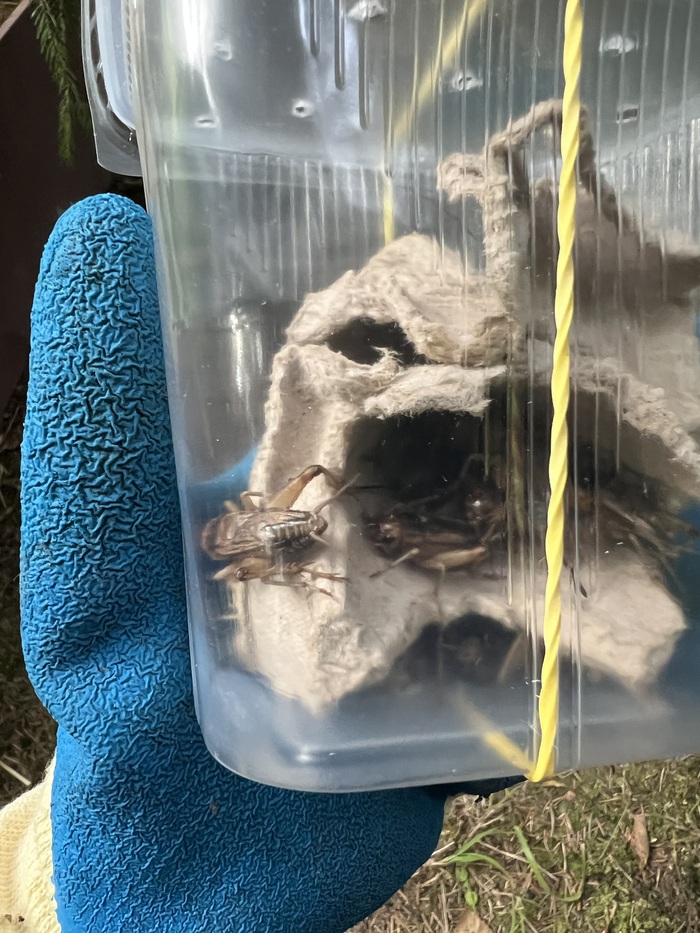 Ежи-малыши медленно, но верно идут к тому, чтоб перестать быть малышами. Насколько мы знаем, мать-ежиха перестает приносить детям еду с ночной охоты в тот момент, когда ежата имеют вес в пределах 200-300 грамм. После этого мать начинает брать потомство с собой на небольшие вылазки. Мы пытаемся сымитировать начало охоты для Сида и Нэнси. Для этих целей используем маленьких лягушек, которых запускаем в загон, или саранчу которую выпускаем в домик на ночь. Все таки мы не уверены, что ежики после зимовки останутся жить на нашем участке, а не убегут в лес. Поэтому они должны уметь охотиться и добывать пищу без наших прикормов.