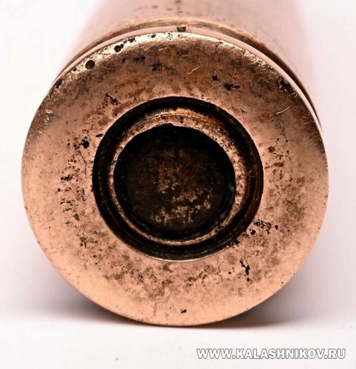 — металл гильзы красноватого оттенка, что может свидетельствовать об её изготовлении из бронзы, некоторые разновидности которой имеют такую особенность внешнего вида.