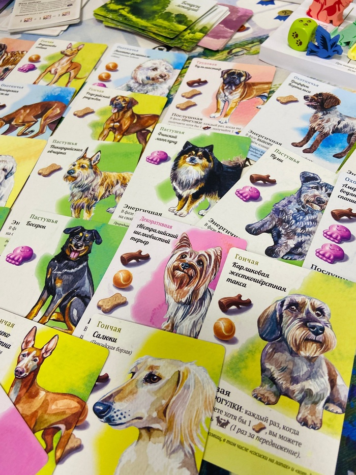 Над игрой работало три художника и их труд стоит оценить по достоинству — кроме прочих компонентов, в "Прогулках с собаками" 163 карты с полноразмерными иллюстрациями, изображающие десятки различных собачьих пород. Кроме того, вас ждут деревянные фишки выгульщиков, лакомств, игрушек и палочек, плотные планшеты и множество других компонентов.