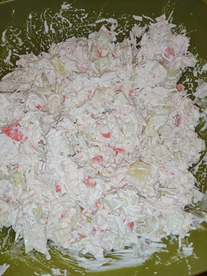 На этот салат я наткнулся абсолютно случайно - я тогда служил в одном из подразделений питерского полицейского главка и обедать ходил в местную столовую. Важная историческая ремарка - салаты с крабовыми палочками я очень люблю. Ну, и тогда я пришел в компании коллеги и увидел салат с крабовыми палочками и сразу понял, что буду его есть. Набрали еды, короче. Сидим едим. И тут коллега меня спрашивает: