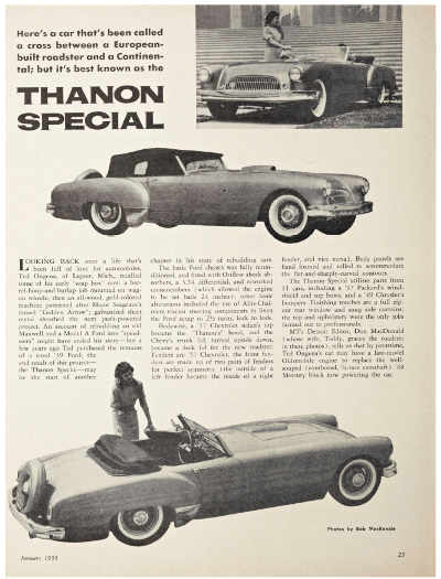 Удивительно, но Thanon до сих пор цел, хотя в последний раз, когда его видели, он был не в лучшем состоянии. Если бы не любопытство автожурналистов (неделю назад фото этого автомобиля завирусились в сети), он мог бы быть утерян и забыт навсегда. Насколько нам известно, единственная опубликованная статья о Thanon появилась в выпуске журнала Motor Trend за январь 1955 года в статье, написанной редактором MT Detroit Доном Макдональдом (ниже).