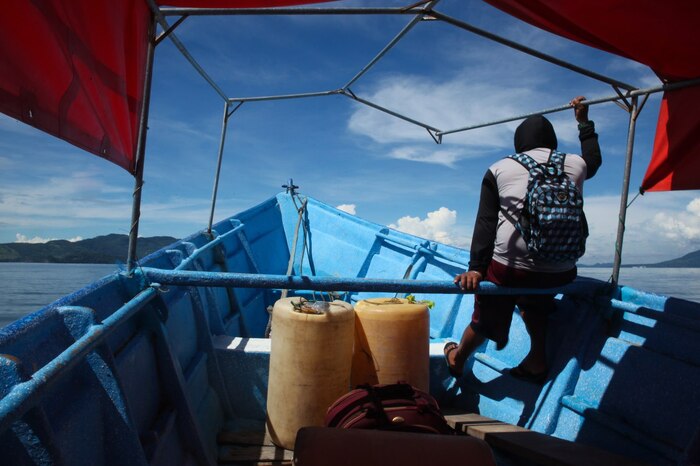 Не доходим до него, глушим мотор и переходим на весло. Ну, то есть на весло перехожу я, потому что моя персона заняла в лодке место третьего рыбака и кто-то должен делать его работу — не давать волнам крутить лодку кругами, а медленно направлять её по параболообразному маршруту. Чементо и Энджи начинают выбрасывать сеть за борт. Длина сети примерно пара километров, у её конца, начала и посерединке привязаны пустые пластиковые канистры — они, как поплавки держат сеть и не дают её потерять.