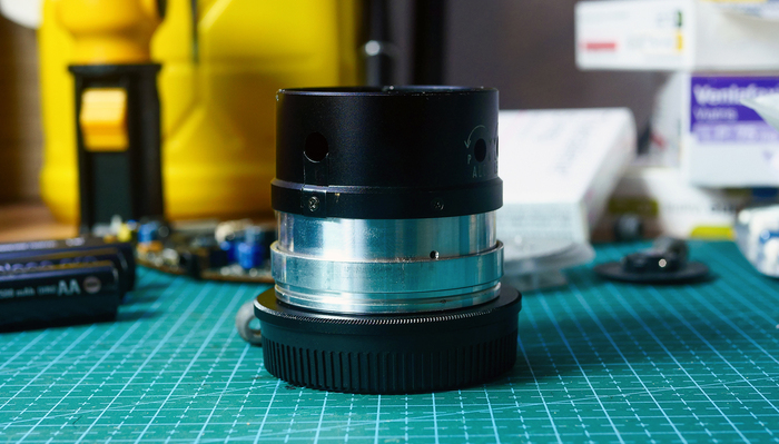 Ничего сложного здесь нет, нужно разобрать объектив, отрезать провод и всё, что мешает, зафиксировать диафрагму и собрать обратно.