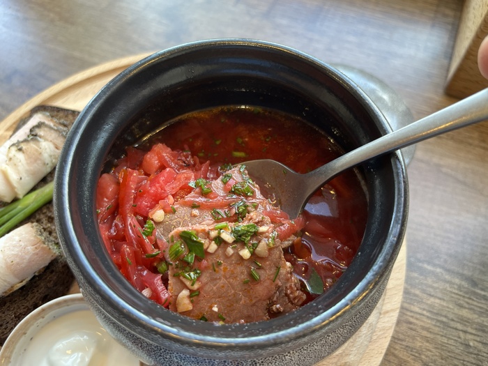 В супе плавают солидные кусочки мяса... и на этом всё. Самое удачное в этой комбинации – хлеб с салом. Потому что борщ меня совсем не впечатлил. Какая-то невразумительная сладковатая жижа с ярко выраженным вкусом томатной пасты. Хорошо, что горячий. Но этот борщ проигрывает любому столовскому. Допускаю, что в другой день он может быть вкуснее (тупо мне в этот раз просто не повезло), но я бы не советовал играть в эту рулетку.