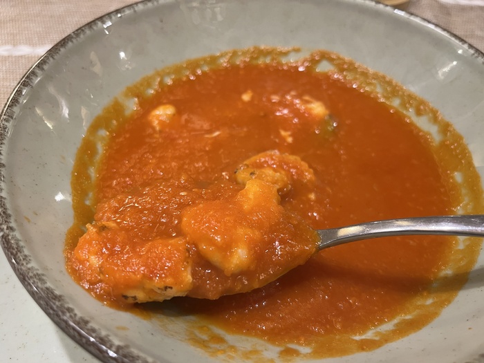 Однако с креветками тут вышло как-то не совсем органично. Сварившись в томатной массе, они приобрели дополнительный привкус, не особо вписывающийся в ожидаемую гармонию. Коллегиальный вывод – можно было обойтись без креветок, было бы вкуснее.