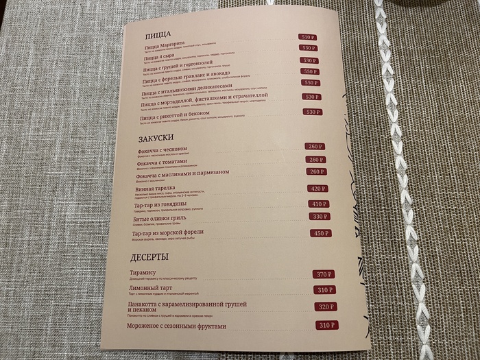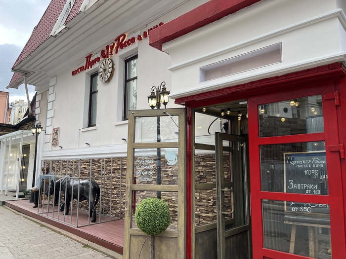 На память мне сразу приходит парочка, к сожалению, неудачных заходов в столичную «итальянскую кухню» – и там было на порядок дороже. Бистро, в котором не научились делать пасту и подают её в одноразовой бумажной посуде, и итальянский «фикспрайс» по 600 рублей, где есть апломб, но не нашлось места для вкуса, да и вообще всё там было очень несуразно. В обоих случаях на пафосе – где ещё вы такую еду за такие деньги в Москве найдёте?
