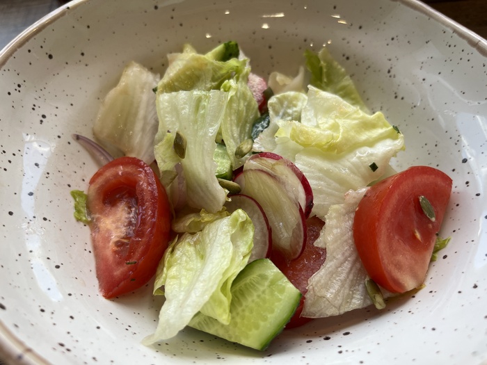 Как я уже сказал, первым прибыл салат «Батькина грядка» (в основном меню 249₽). Выглядит очень свежо: салат айсберг, помидоры, огурцы, редиска, лук, тыквенные семечки.