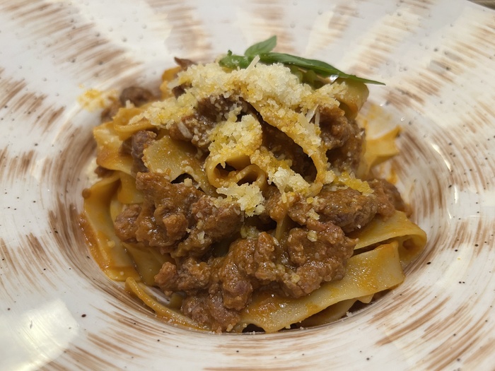 Великолепно! И паста хороша – отчётливо чувствуется качество продукта и умение с ним работать (тут я легко соглашусь с тезисом про итальянскую бабушку), и соус прекрасен. Нежный, в меру пряный фарш в томатном соусе. Всё работает на наслаждение – эта паста Болоньезе отличный пример для тех, кто считает, что недорогую качественную пасту у нас днём с огнём не найти. Вот, пожалуйста. Берите на заметку.