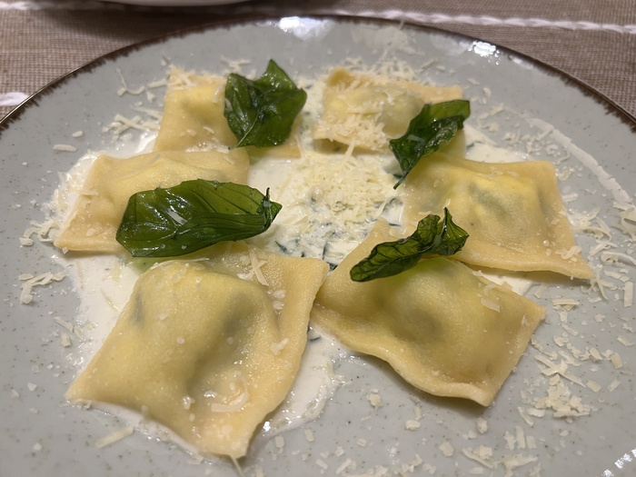 Вдогонку мы не могли не попробовать равиоли с брынзой и шпинатом (430₽). Выбор сделан скорее из стремления сложить полную картину местной кухни, но всё равно трудно объять необъятное.