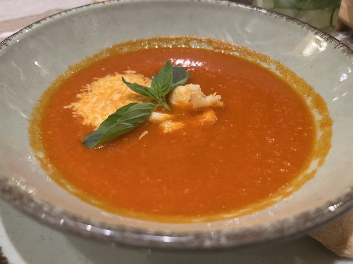 На «первое» взяли томатный суп с креветками (360₽) – помидоры, тимьян, розмарин, базилик, креветки, оливковое масло, страчателла. К супу прилагается фокачча.