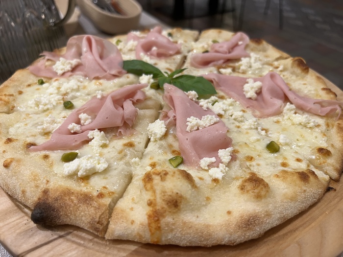 Из шести видов пиццы мы остановили свой выбор на позиции пицца с мортаделлой, фисташками и страчателлой за 530 рублей. В описании можно обнаружить некоторое противоречие – орех уже пекан, а вместо страчателлы указан трюфельный творог.