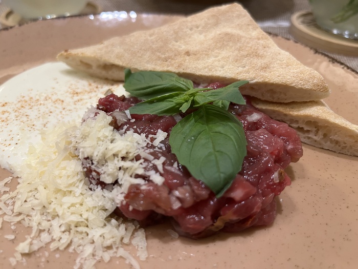 Сырая говядина, трюфельная заправка, пармезан, веточка салата. К блюду подаётся фокачча – два треугольничка, как раз, чтобы оба едока были довольны. Отличный тартар, всё безупречно выполнено.