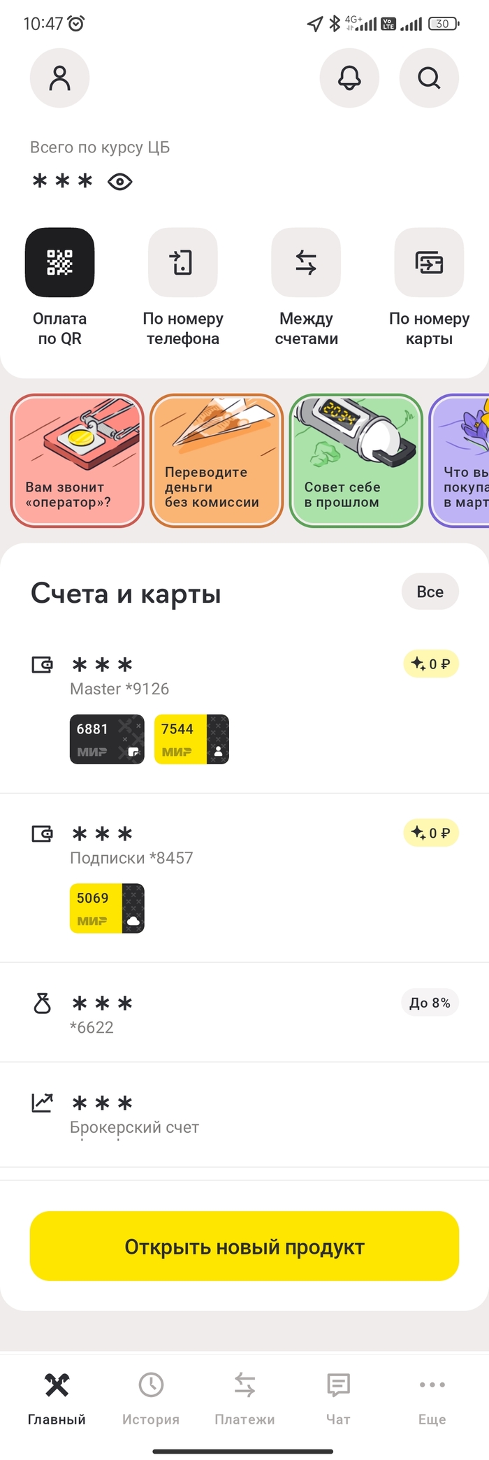 Недавно приложение банка обновилось. Полностью перерисовали главный экран, теперь основным продуктом на нем выступают счета. К каждому счету теперь указывается наличие выпущенных карт. Также для приложения теперь доступен выбор темной темы. Это вопрос вкуса, но в последнее время, мне светлые темы нравятся больше. В галерее можно посмотреть как выглядит начальный экран в светлом, либо темном оформлении.