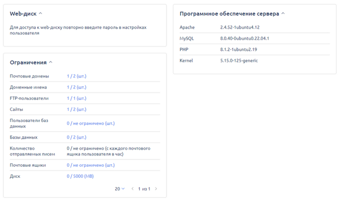 Вывод: Система минималистична — нет предустановленных веб-серверов. Лимиты стандартные.